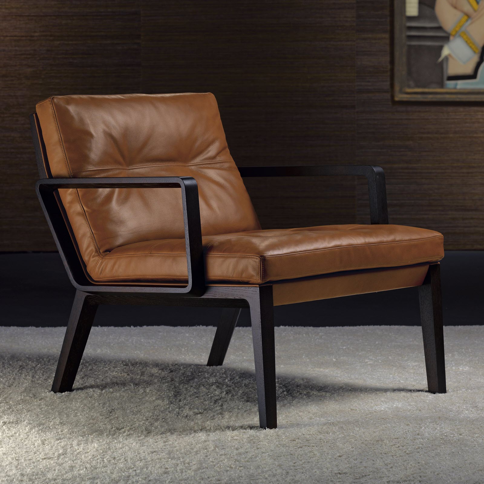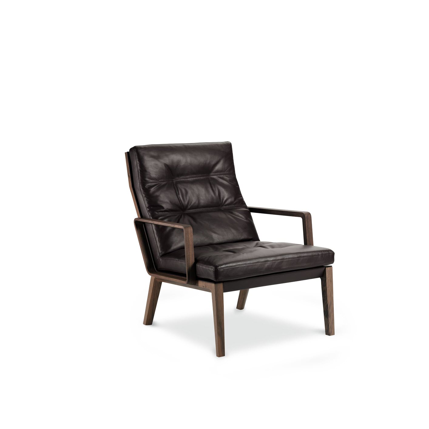 Inviting upholstery, soft leather with integrated piping, wood delicately shaped towards the inside complement each other to create a fine armchair. It comes with a high or low back, with armrests and a footstool if desired.