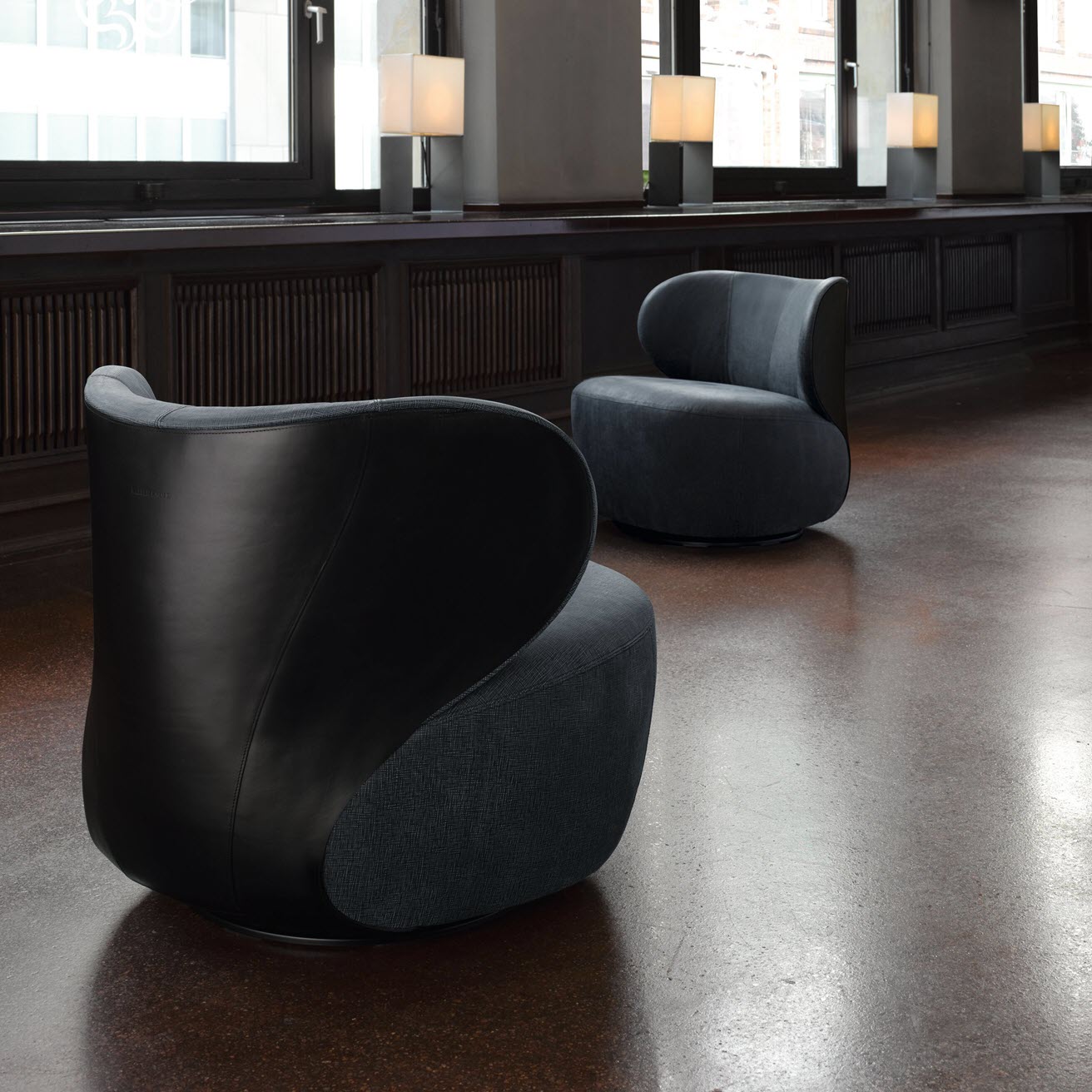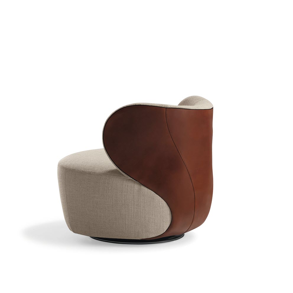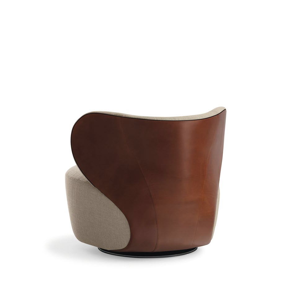 This armchair combines the materials whilst keeping them distinct: classy saddle leather on the back, natural fabric for the seat. Bao – as familiar as a welcoming embrace. The swiveling armchair is available in all fabric and leather combinations, completely covered in fabric or leather.
